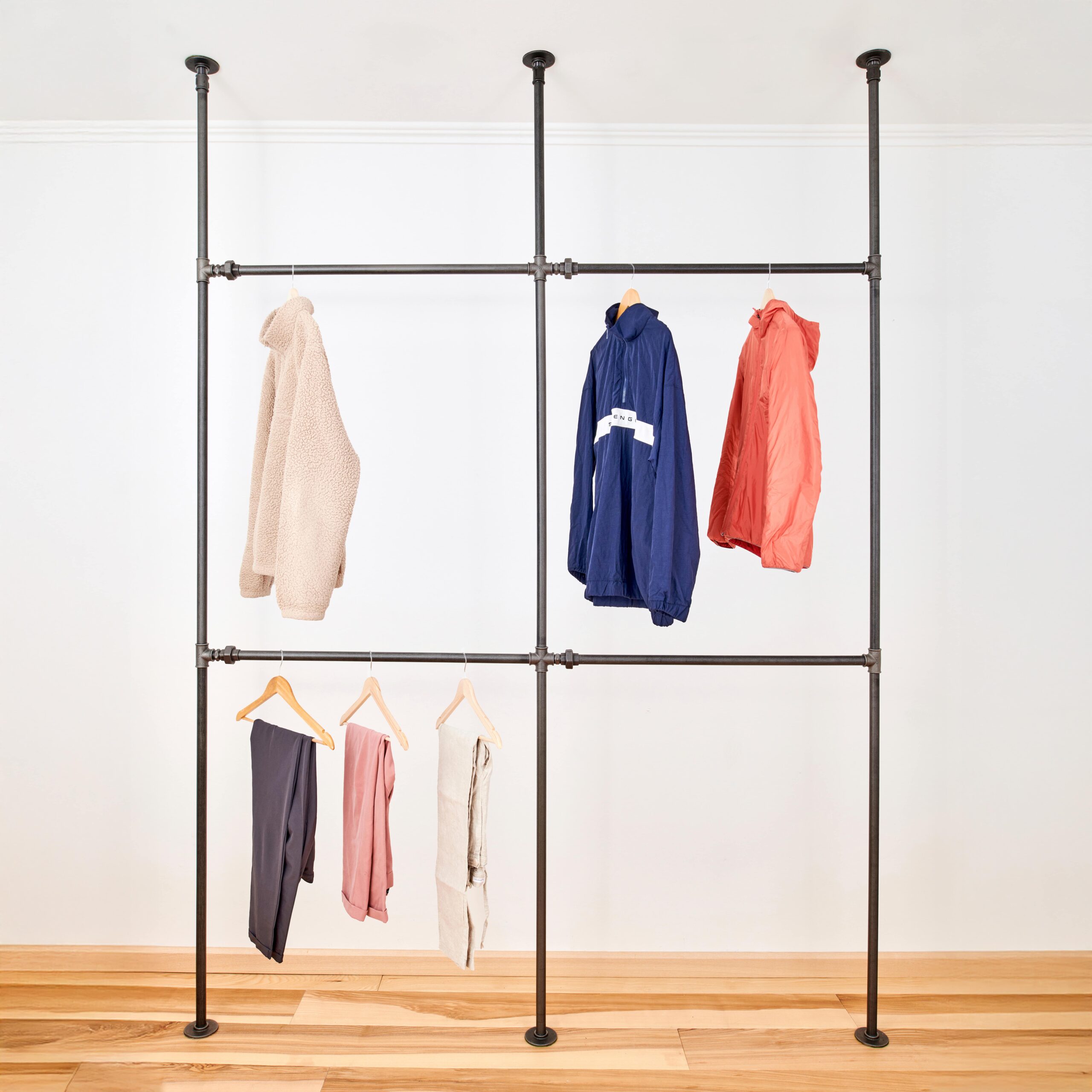 Die Kleiderstangenkombination Brustlatz bringt industriellen Minimalismus und clevere Raumnutzung in Einklang. Mit ihrer Breite von 191 cm und einer Gesamtlänge der Kleiderstangen von 2,4 Metern bietet sie reichlich Platz für die unterschiedlichsten Kleidungsstücke . Die höhenverstellbare Montage ermöglicht es, die Konstruktion perfekt auf den Raum abzustimmen.