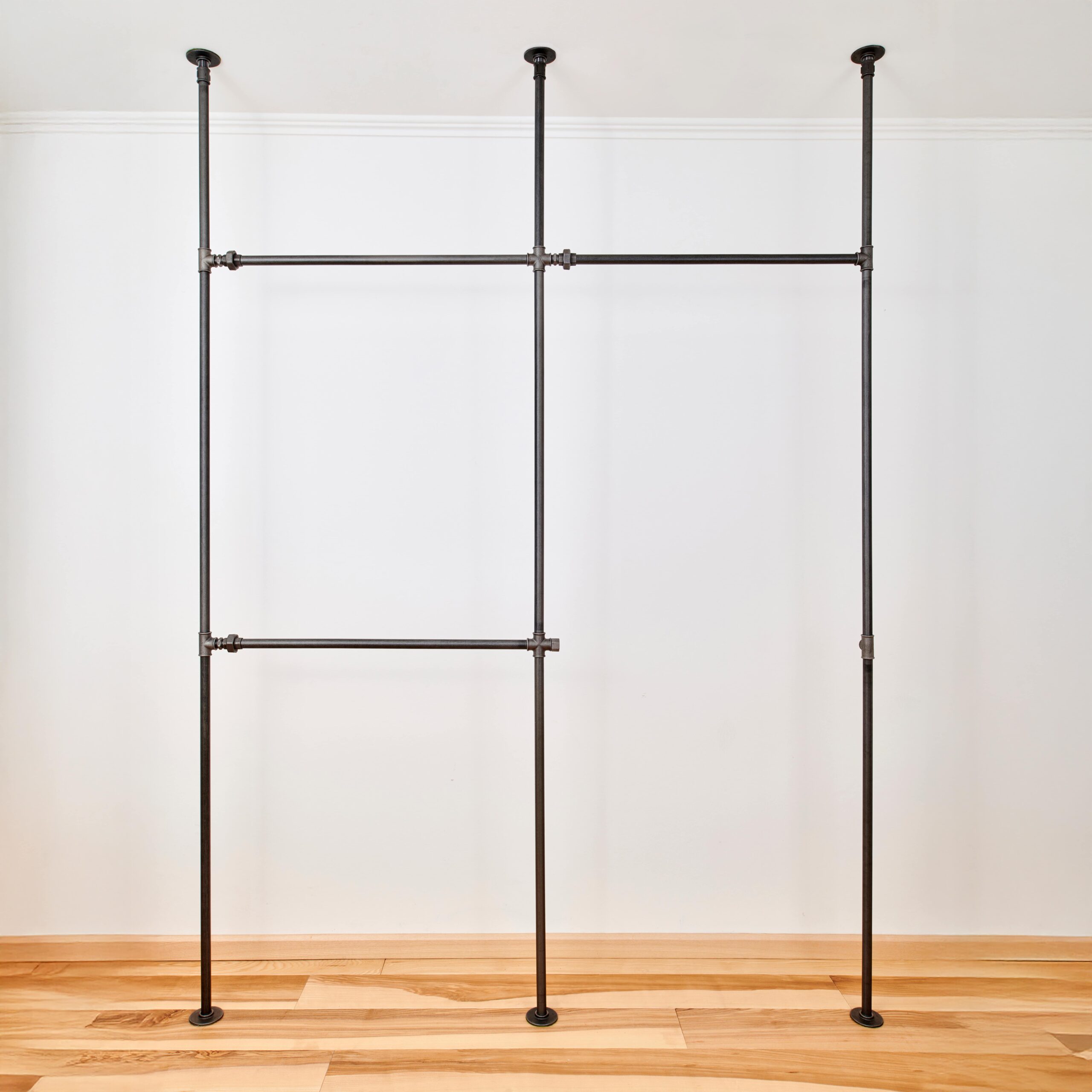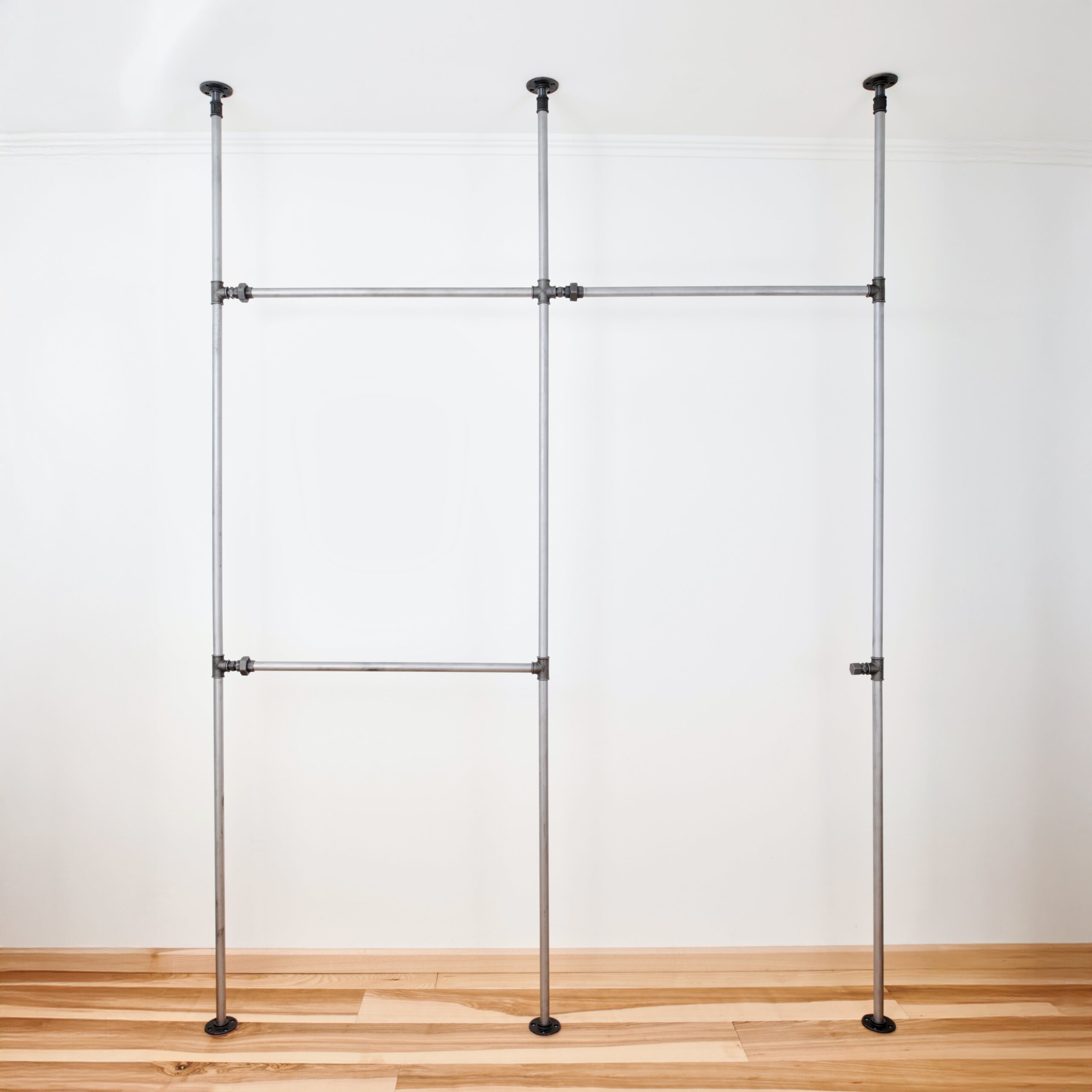 Gefertigt aus robusten Designrohren in ¾ Zoll, ist die Kleiderstange Gewandschuh in drei Ausführungen erhältlich: Anthrazit (Ton in Ton mit den Fittingen), Silber oder eine unbehandelte Oberfläche für einen puristischen Industrie-Look. Massive Fittinge aus Temperguss sorgen für Stabilität und unterstreichen den markanten Industrial-Charakter. Durch die Boden-Decke-Montage steht die Kleiderstange sicher auf dem Boden, während die obere Befestigung an der Decke für zusätzliche Stabilität sorgt. Mit 22 kg Eigengewicht ist sie besonders belastbar und für den täglichen Einsatz konzipiert.