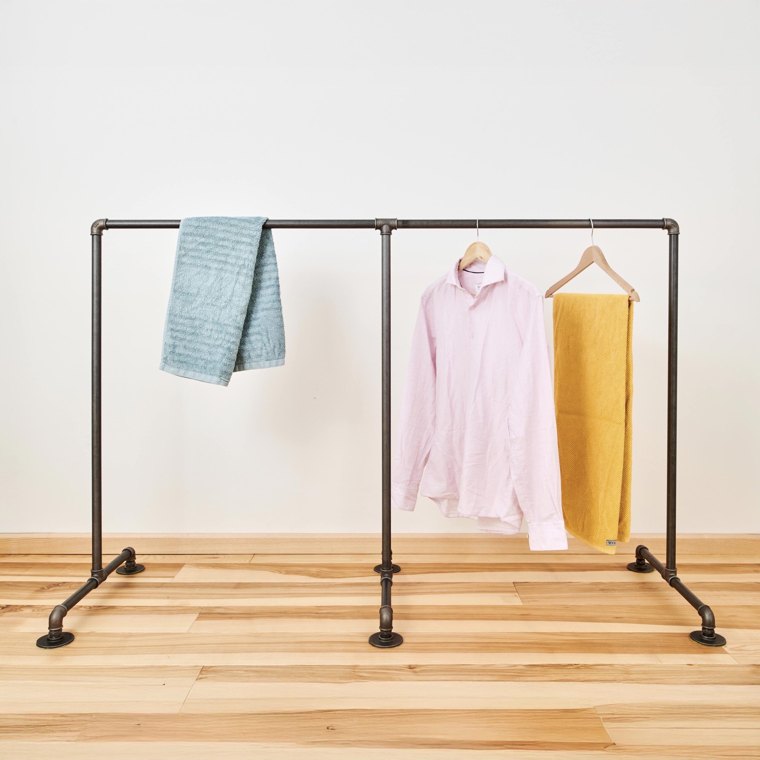 Entdeckt die Vielseitigkeit unseres mobilen Kleiderständers Pelotte im Industriedesign: Handgefertigt aus stabilen Wasserrohren und Verbindern, bietet er flexible Aufbewahrungsmöglichkeiten